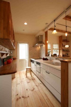 味わい深い珪藻土の手塗り壁とオイル仕上げの無垢フロアーはオーナーご夫婦によるハンドメイド。自然素材に囲まれた素敵な手づくりフレンチハウスが完成しました。