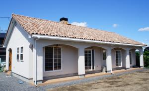 白い外壁と明るい屋根が青空に映えるかわいらしい南欧風の平屋。